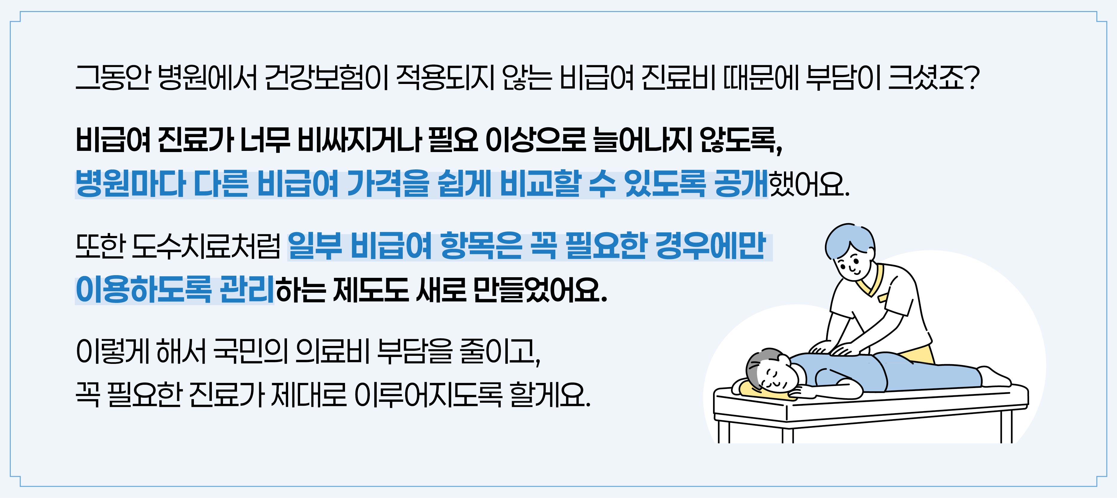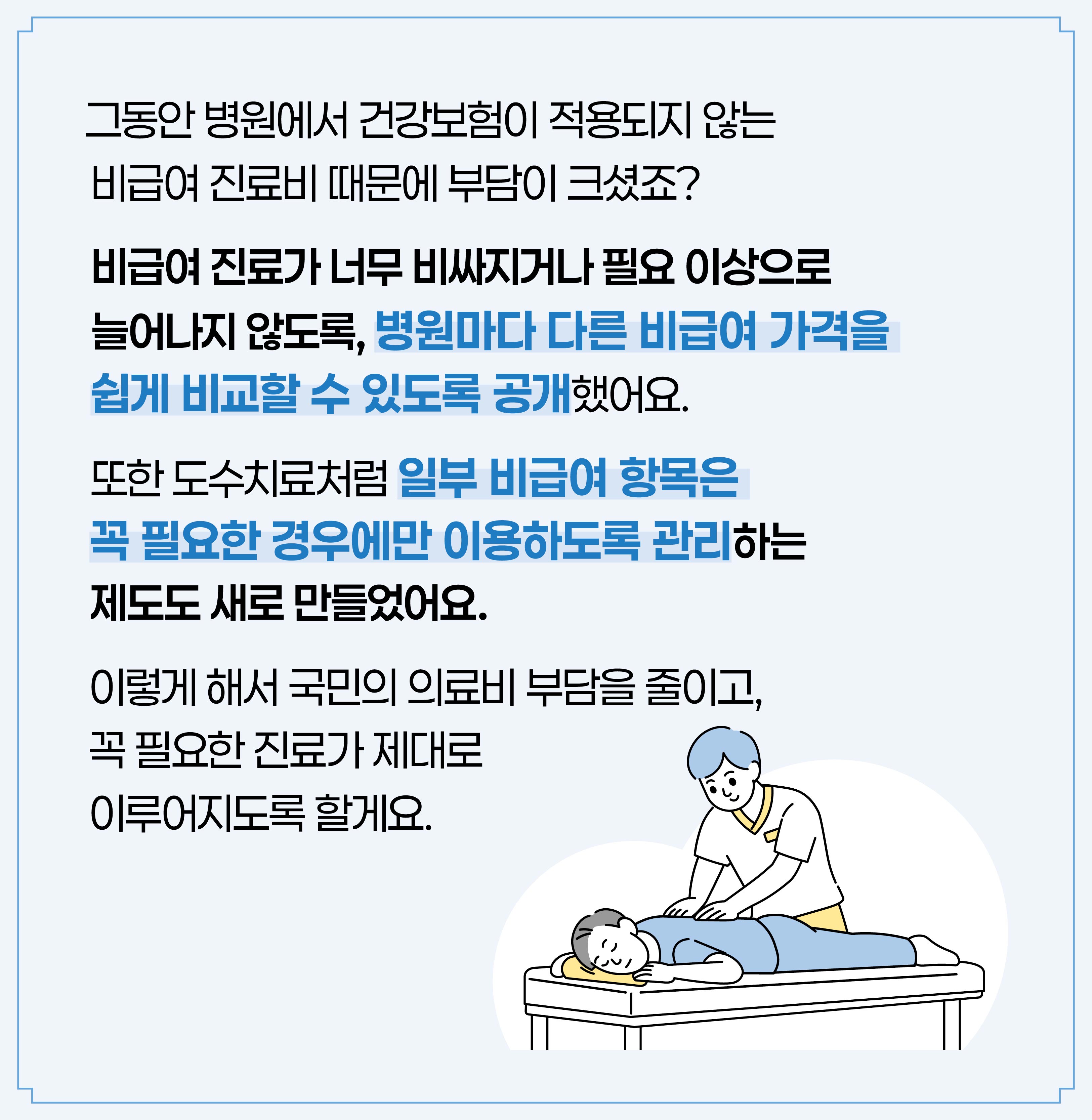 그동안 병원에서 건강보험이 안되는 비급여 진료비 때문에 부담이 크셨죠? 비급여 진료가 너무 비싸지거나 필요 이상으로 늘어나지 않도록, 병원마다 다른 비급여 가격을 쉽게 비교할 수 있도록 공개했어요. 또한 도수치료처럼 일부 비급여 항목은 꼭 필요한 경우에만 이용하도록 관리하는 제도도 새로 만들었어요. 이렇게 해서 국민들의 의료비 부담을 줄이고, 꼭 필요한 진료가 제대로 이루어지도록 할게요.