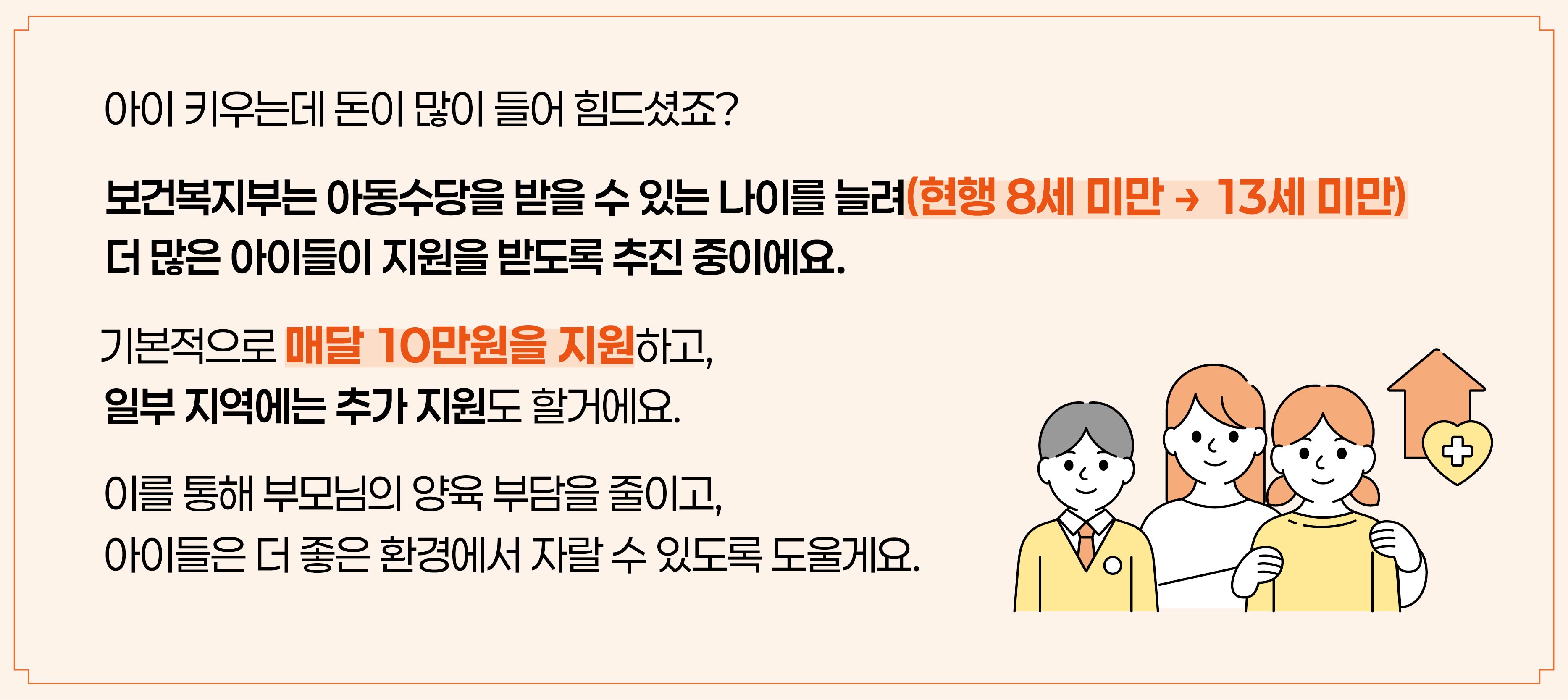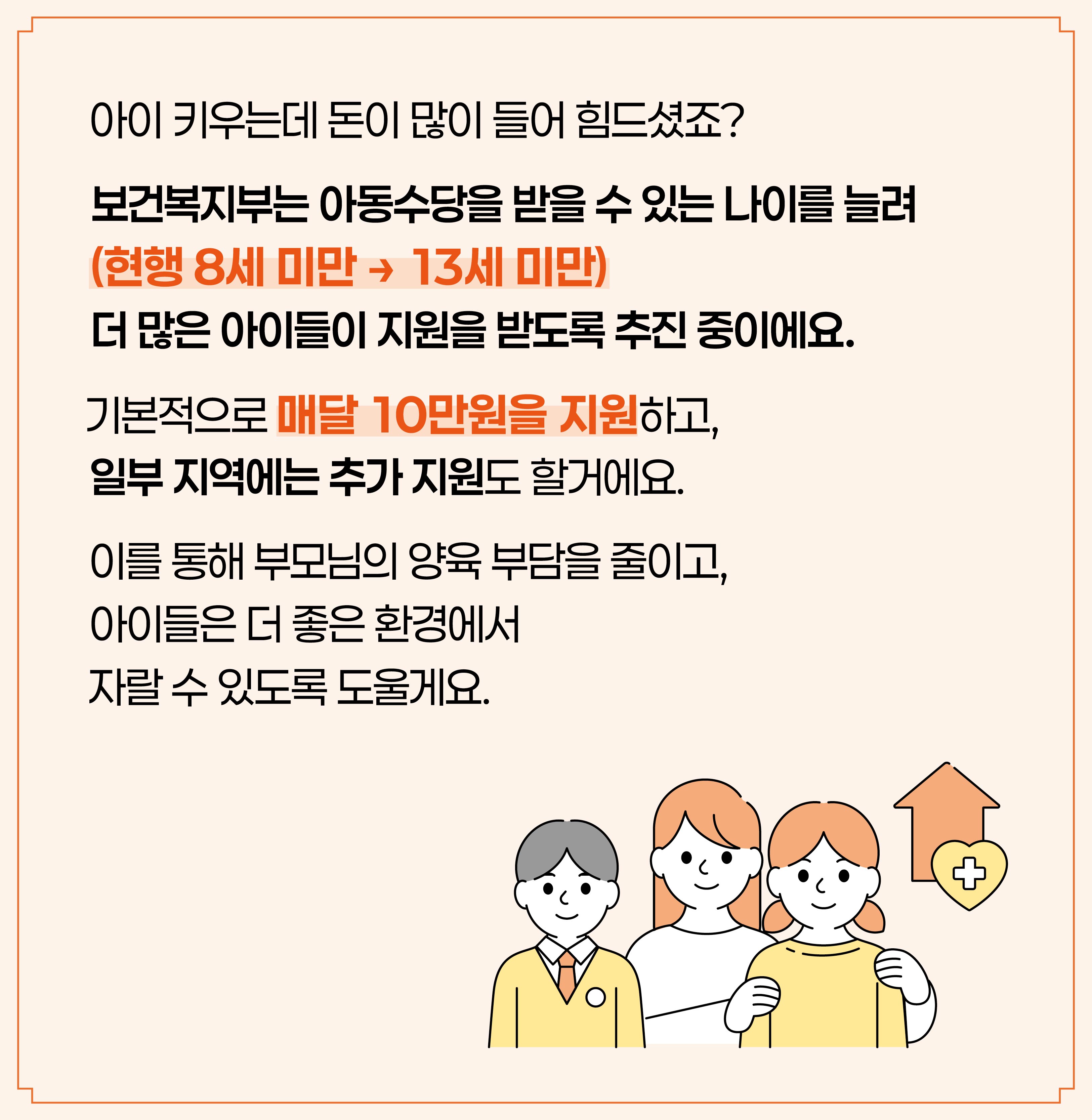 아이 키우는데 돈이 많이 들어 힘드셨죠? 보건복지부는 아동수당을 받을 수 있는 나이를 늘려(현행 8세 미만 → 13세 미만) 더 많은 아이들이 지원을 받도록 추진 중이에요. 기본적으로 매달 10만원을 지원하고, 일부 지역에는 추가 지원도 할거에요. 이를 통해 부모님의 양육 부담을 줄이고, 아이들은 더 좋은 환경에서 자랄 수 있도록 도울게요.