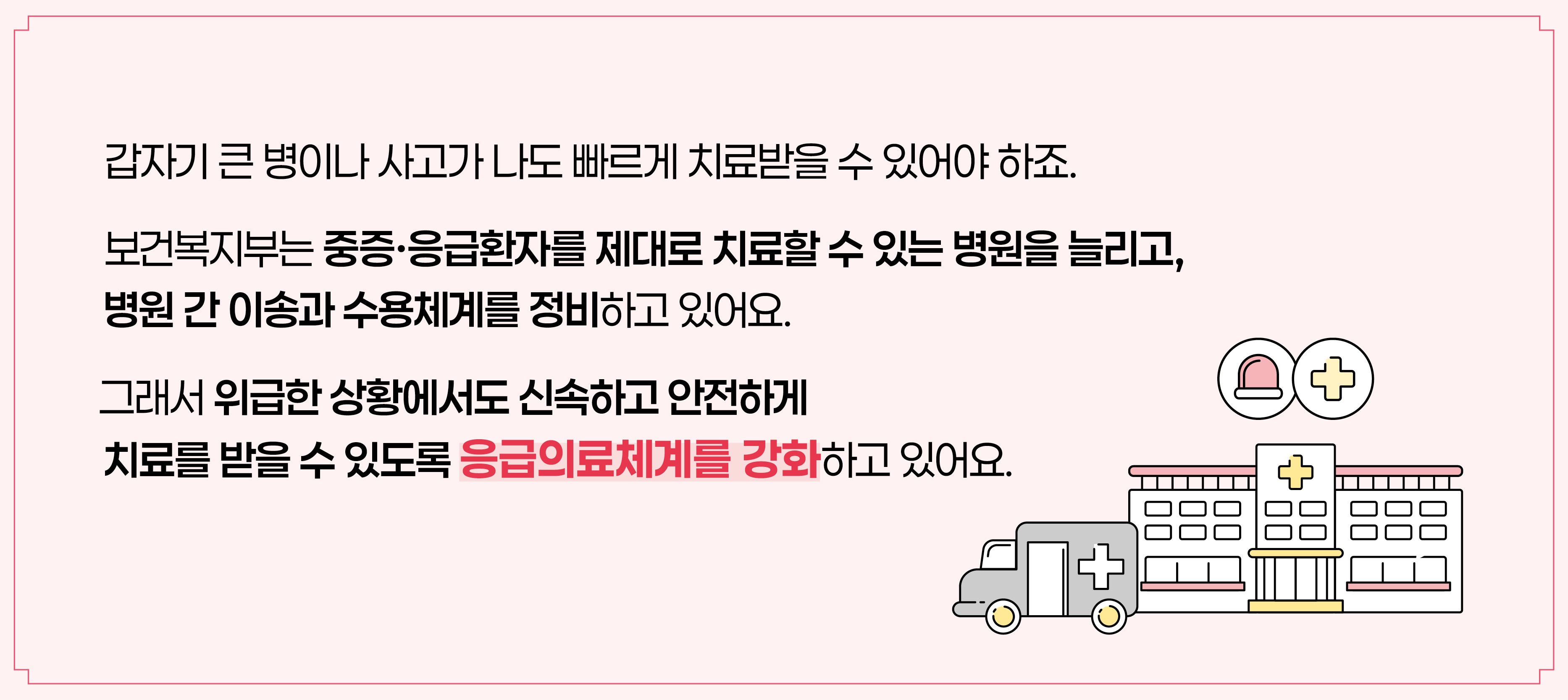 갑자기 큰 병이나 사고가 나도 빠르게 치료받을 수 있어야하죠. 보건복지부는 중증 응급환자를 제대로 치료할 수 있는 병원을 늘리고, 병원간 이송과 수용체계를 정비했어요. 그래서 위급한 상황에서도 신속하고 안전하게 치료를 받을 수 있도록 응급의료체계를 강화하고 있어요.