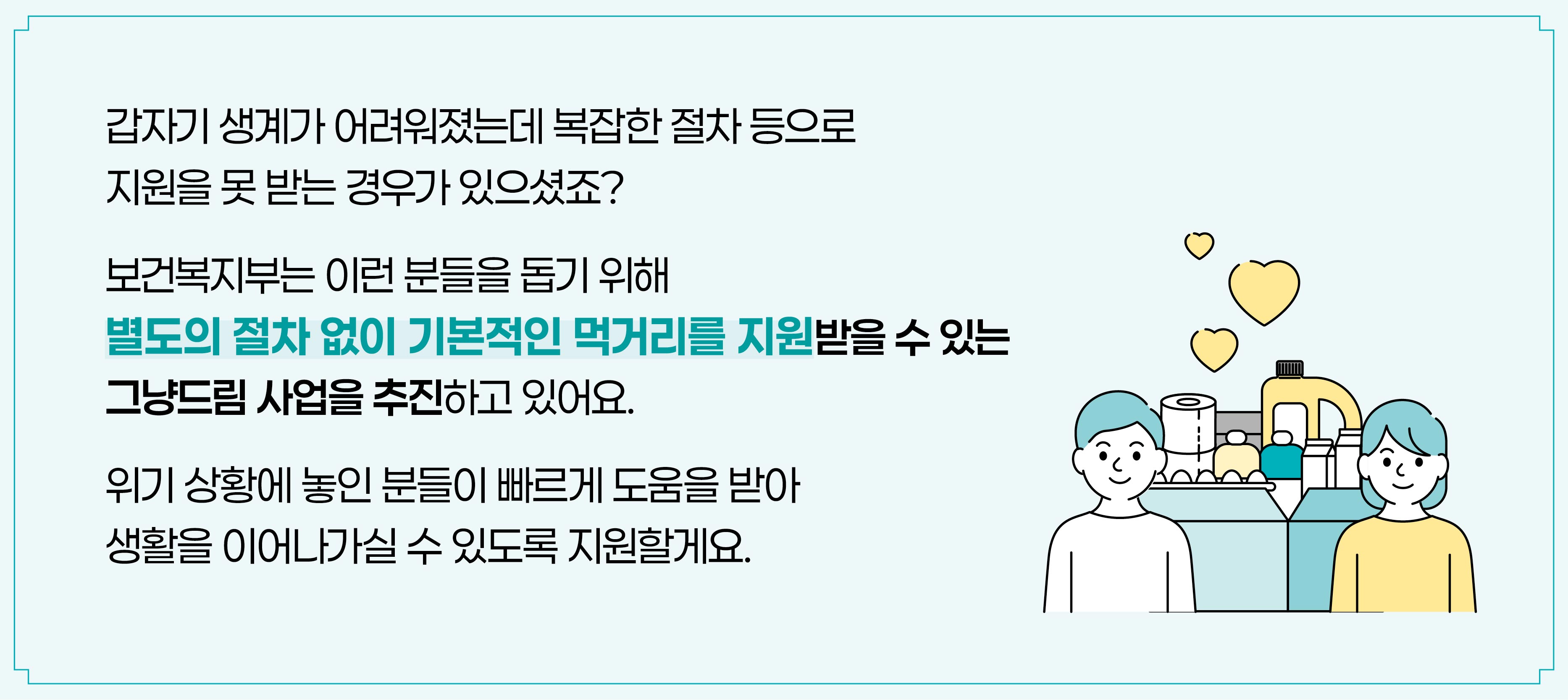 갑자기 생계가 어려워졌는데 복잡한 절차 등으로 지원을 못받는 경우가 있으셨죠? 보건복지부는 이런 분들을 돕기 위해 별도의 절차 없이 기본적인 먹거리를 지원받을 수 있는 그냥드림 사업을 추진하고 있어요. 위기 상황에 놓인 분들이 빠르게 도움을 받아 생활을 이어나가실 수 있도록 지원할게요.