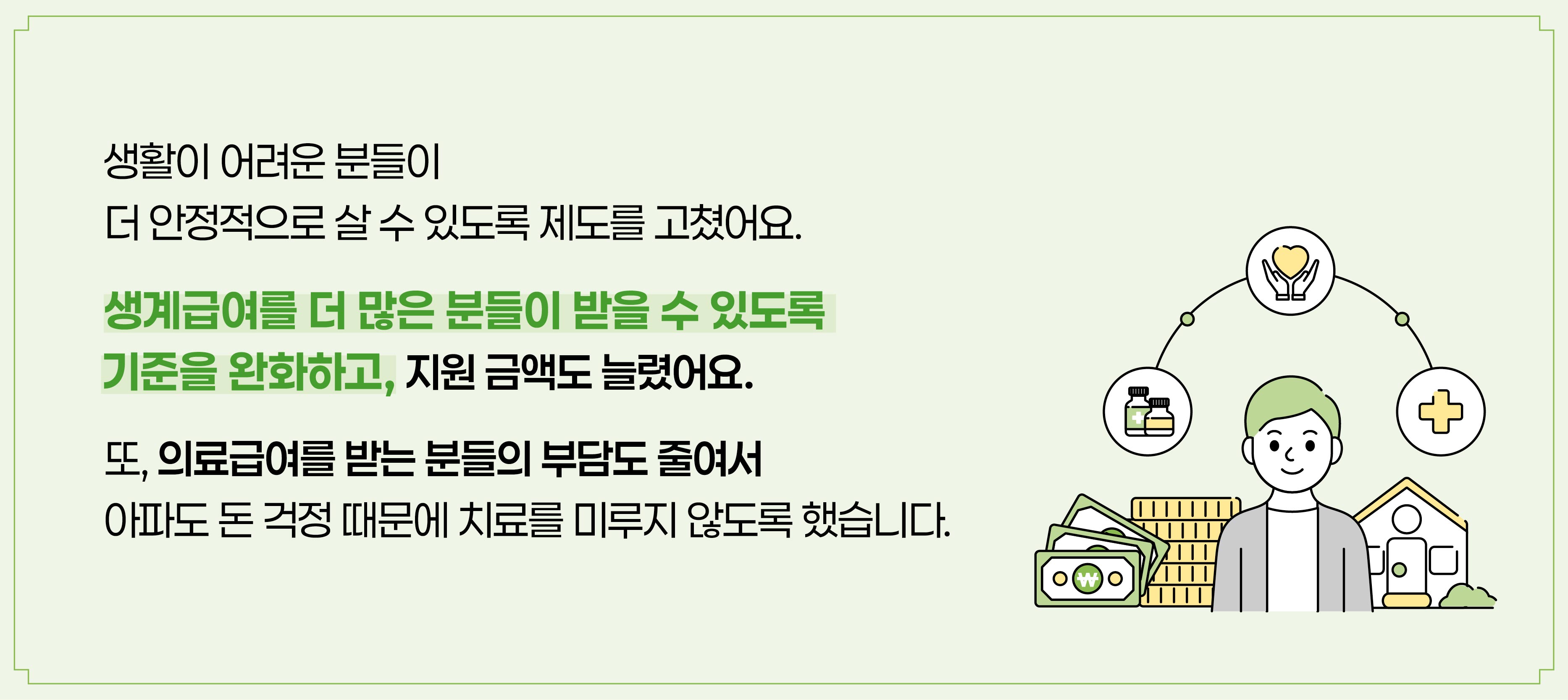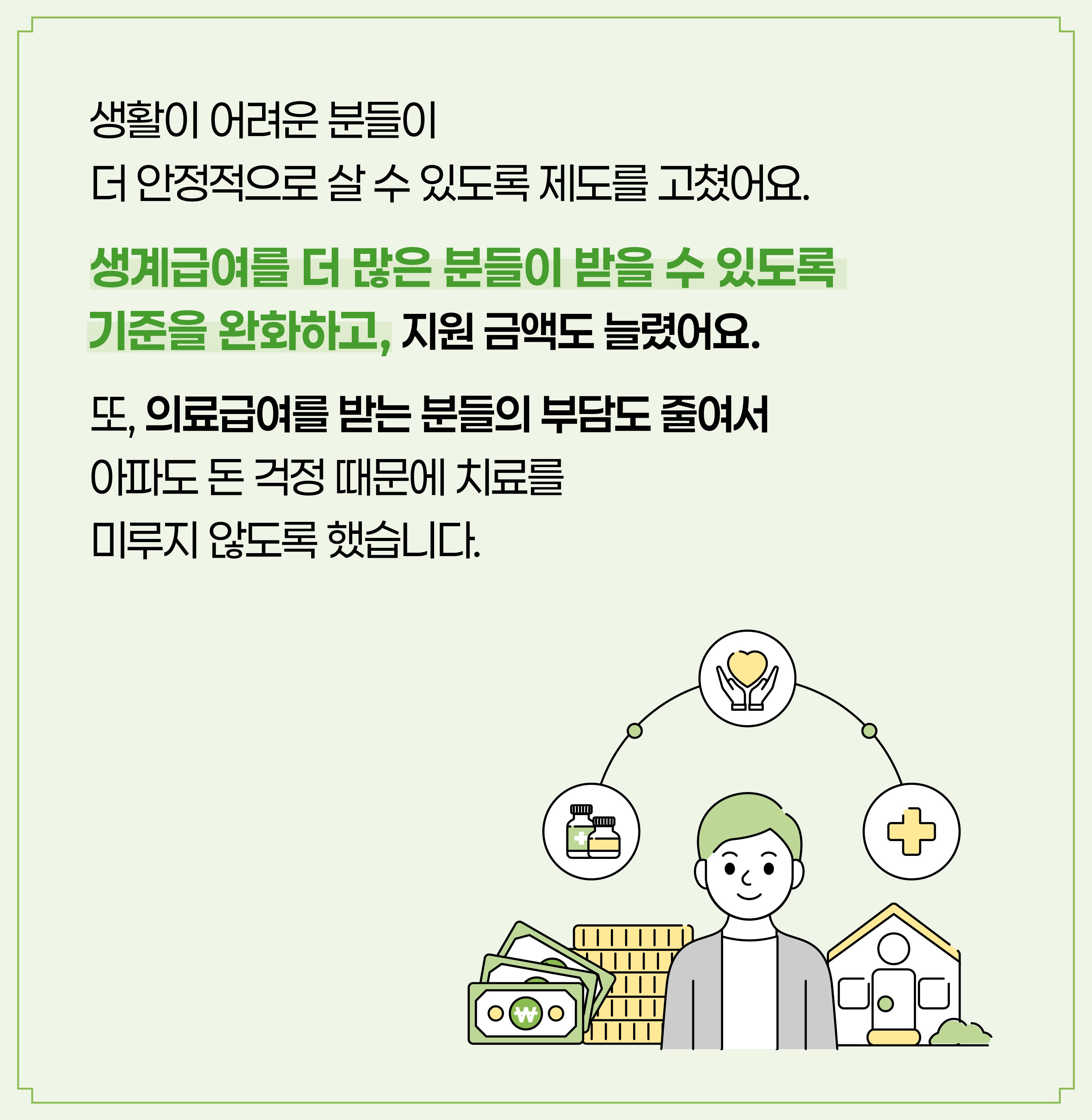 생활이 어려운 분들이 더 안정적으로 살 수 있도록 제도를 고쳤어요. 생계급여를 더 많은 분들이 받을 수 있도록 기준을 완화하고, 지원 금액도 늘렸어요. 또, 의료급여를 받는 분들의 부담도 줄여서 아파도 돈 걱정 때문에 치료를 미루지 않도록 했습니다